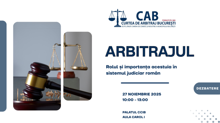 Curtea de Arbitraj București de pe lângă Camera de Comerț și Industrie a Municipiului București are plăcerea de a anunța organizarea dezbaterii intitulată ”ARBITRAJUL – rolul și importanța acestuia în sistemul judiciar român”, care va avea loc în data de 27 noiembrie 2025, în intervalul orar 10:00 – 13:00,la sediul Camerei de Comerț și Industrie a Municipiului București, Str. Ion Ghica nr. 4, sector 3, Mun. București, etaj 2, sala Aula Carol I.