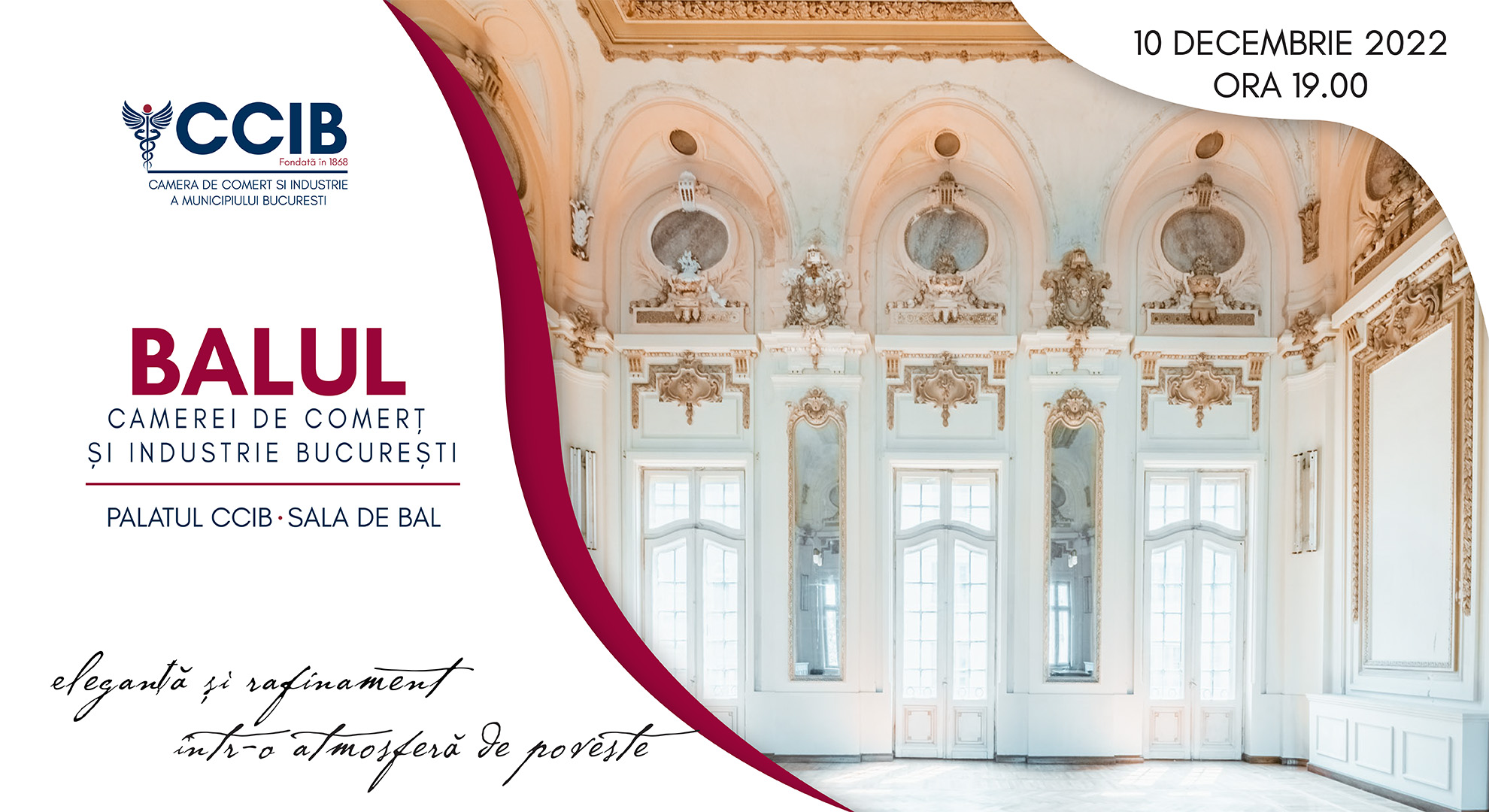 Am deosebita plăcere de a vă invita la prima ediție a Balului Camerei de Comerț și Industrie a Municipiului București, care va avea loc sâmbătă, 10 decembrie 2022, începând cu ora 19,00, la Sala de Bal din sediul nostru istoric (Str. Ion Ghica nr 4).