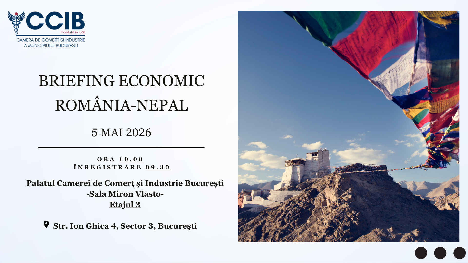 Camera de Comerț și Industrie a Municipiului București (CCIB) are plăcerea de a vă invita să participați la o întâlnire de lucru dedicată explorării oportunităților de colaborare cu Republica Federală Democratică Nepal, prilejuită de vizita oficială a unei delegații la nivel înalt, condusă de domnul Amrit Rai, Secretar de Stat în cadrul Ministerului Afacerilor Externe din Nepal.