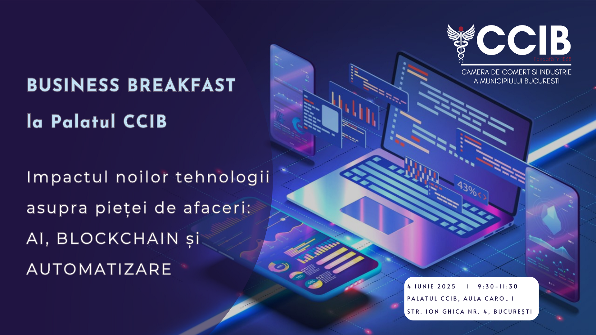 Camera de Comerț și Industrie a Municipiului București (CCIB) vă invita la Business Breakfast-ul dedicat transformărilor profunde pe care noile tehnologii le generează în economia reală.