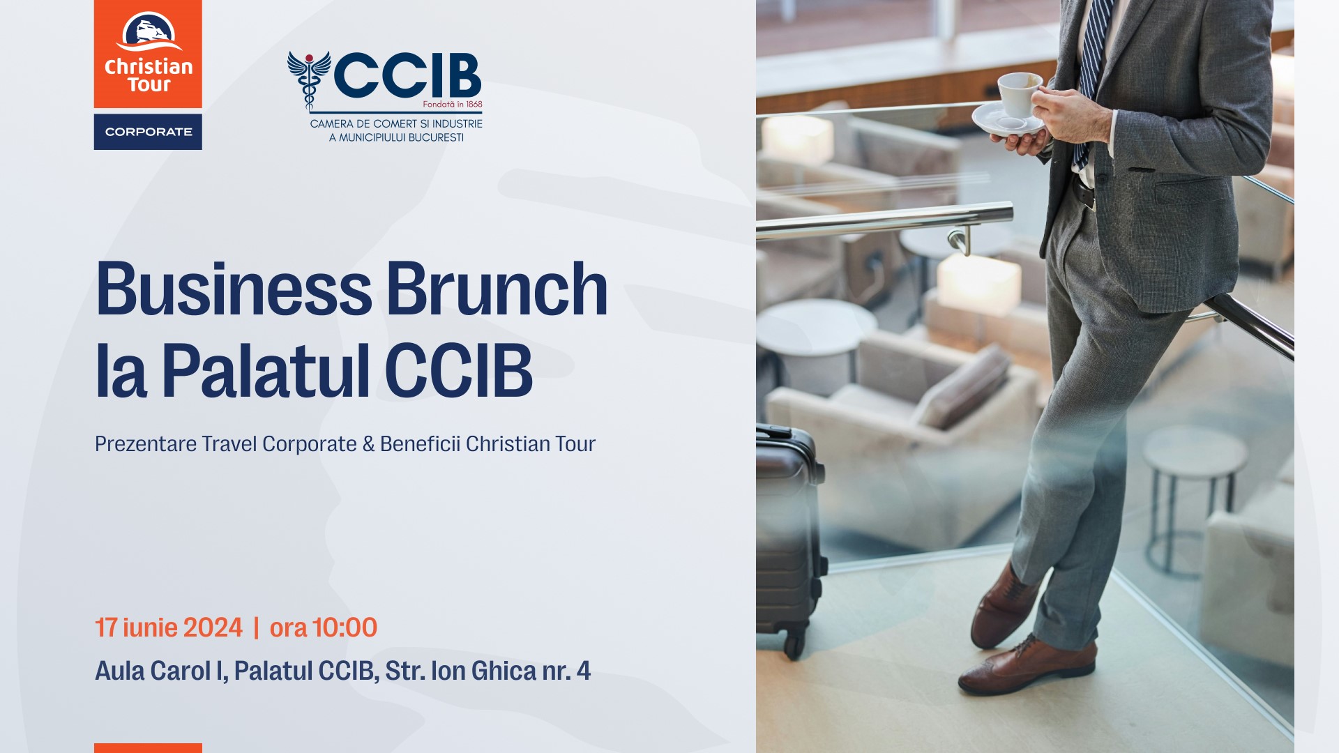 Christian Tour, cea mai mare agenție de turism din România, membră a Camerei de Comerț și Industrie a Municipiului București, organizează luni, 17 iunie începând cu ora 10:00, în Aula Carol I a Palatului CCIB (Str. Ion Ghica nr. 4) un Business Brunch dedicat prezentării serviciilor de călătorie destinate companiilor din București.